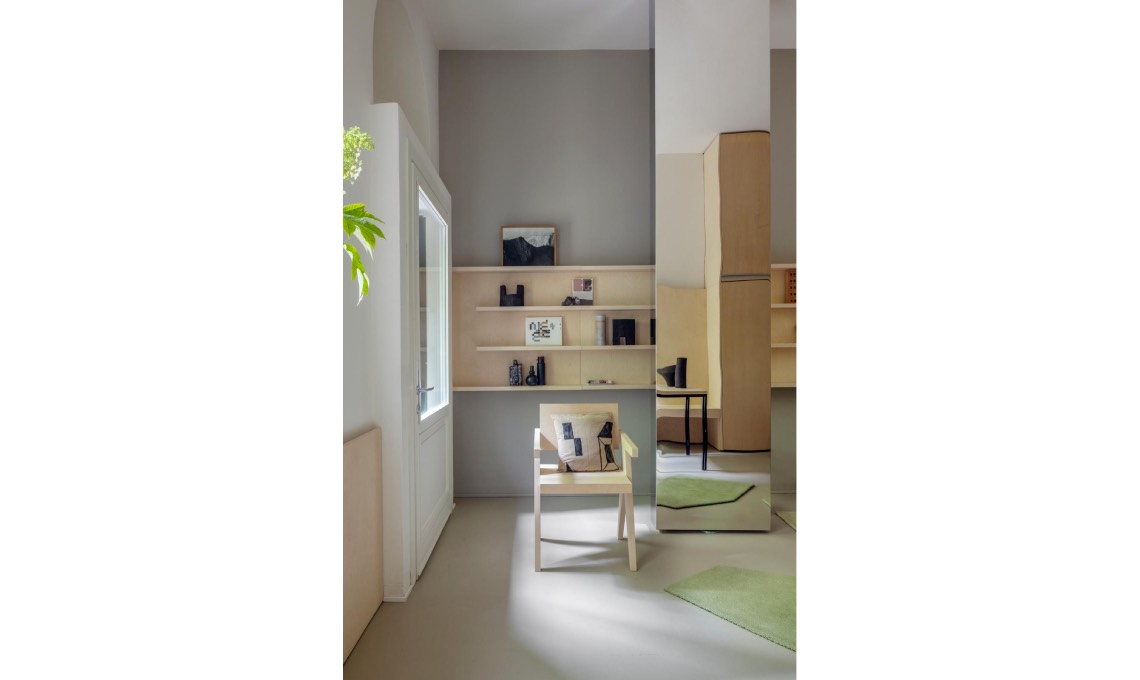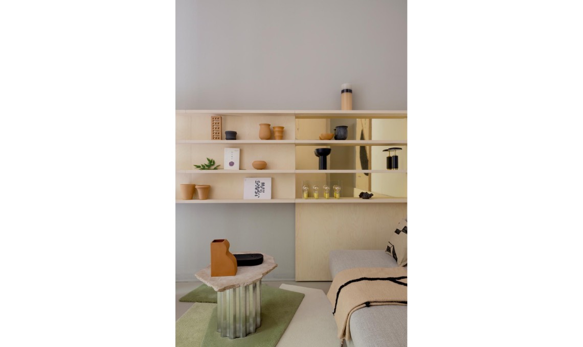 Sulle mensole, sculture [Riccardo Monte] e vasi [Asa Selection e HKliving]; sopra il tavolino in lamiera e marmo [AMArchitectrue], vassoio [Riccardo Monte] e vaso [Maisons du Monde]. Tappeto Sentiero di Margherita [Carpet Edition].