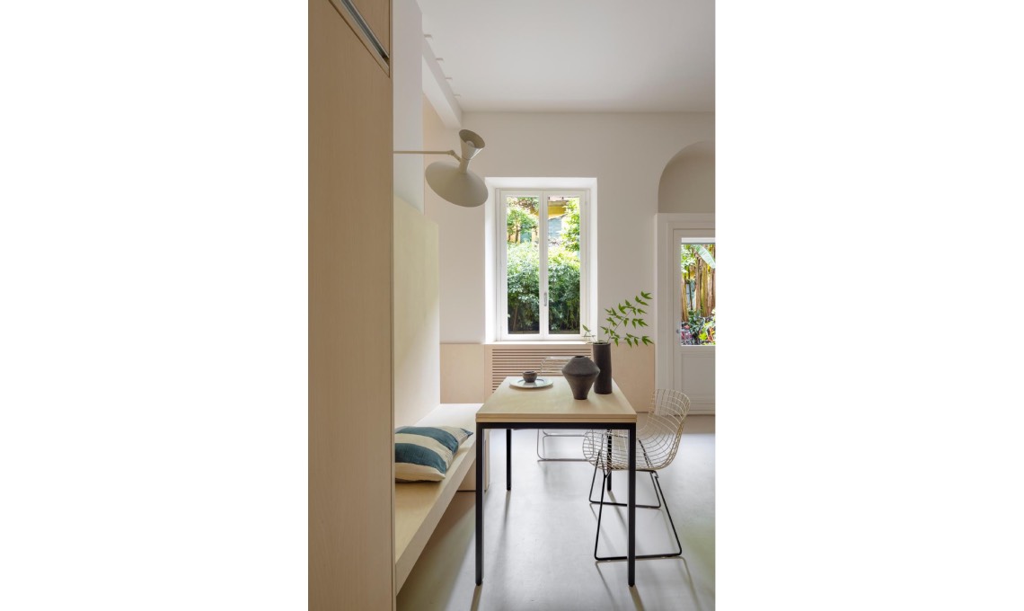 La zona pranzo, organizzata accanto alla cucina, è composta da una lunga panca che serve un tavolo in legno e ferro, tutto progettato da Archiplan Studio. Quando ci sono ospiti basta ruotare le gambe della base, aprire a libro il piano e il tavolo diventa comodo per 5 persone da far sedere sulle sedie icona Bertoia e Plia (che è appesa in camera da letto) e sullo sgabello con seduta in acciaio intrecciato.