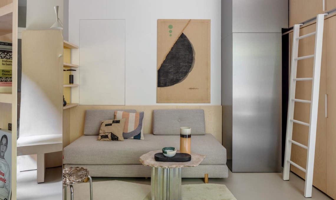 Il soggiorno cambia ruolo in base alle necessità: è salotto, poi cucina, poi pranzo per due o per cinque, poi camera degli ospiti grazie al divano letto. Archiplan Studio ha riorganizzato gli spazi con arredi multifunzione pratici e facili da usare. Daybed Sigmund [da Design Republic] con cuscini [Gisella Beltrami e Marimekko] più plaid [HKliving], quadro Dripping [Luigi Coppola].