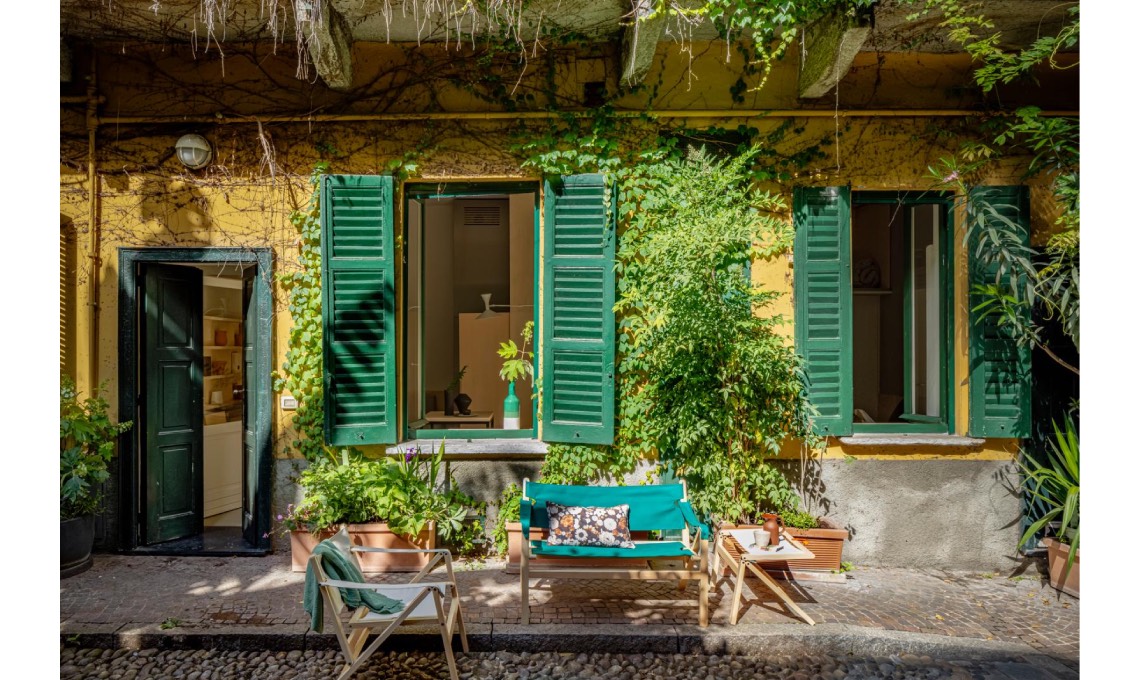 A Milano gli spazi privati all’aperto sono preziosi e questo cortile piccolo ma curato con amore dai suoi abitanti è un vero gioiello in cui crescono rigogliosi edera, banani e bambù. Così con il bel tempo non è inusuale fare due chiacchiere tra vicini seduti nel salottino en plein air che Alessandra ha allestito con arredi di design pieghevoli che si possono riporre appesi all’interno quando non vengono usati. Divanetto, poltroncina con tavolino, tutti pieghevoli, della serie Mehari in tessuto canvas removibile [Campeggi Design], plaid verde Summer [Fazzini] e cuscino a fiori [HKliving].