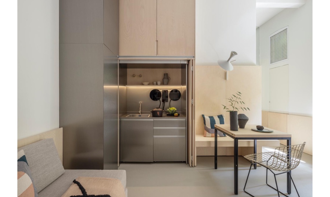Quando è ora di mangiare basta aprire il mobile per mettere in luce la cucina XS ma completa. Realizzata su disegno di Archiplan Studio, ha le ante che rientrano ai lati per lasciare lo spazio libero e muoversi con agio. Sulla parete accanto, la colonna con il frigo è rivestita in acciaio satinato come la cucina, a contrasto con la betulla. Grazie a una scaletta che scompare nella colonna si accede facilmente all’armadio superiore che arriva fino al soffitto. Nella cucina realizzata su disegno di Archiplan Studio: tagliere in legno carbonizzato [Riccardo Monte], pentola in terracotta [Muubs], piastre a induzione Ordine da appendere quando non si usano [Fabita].