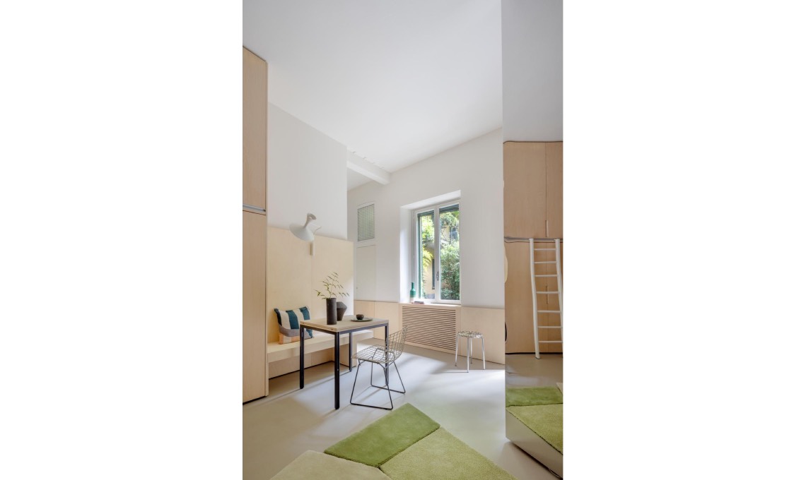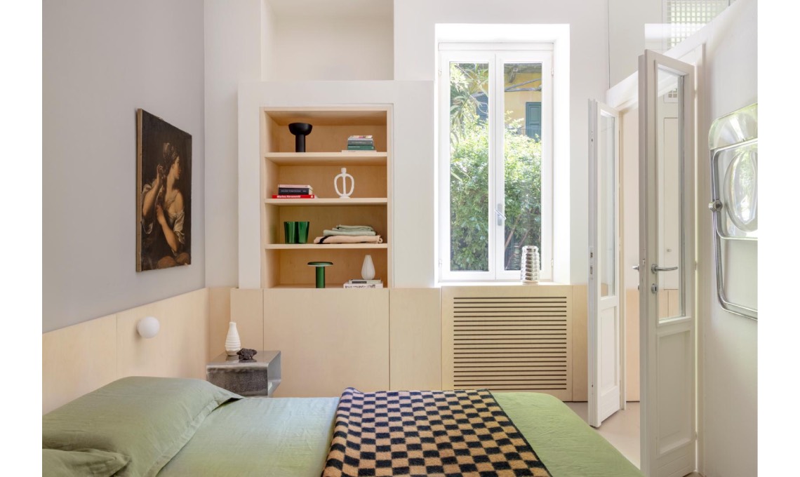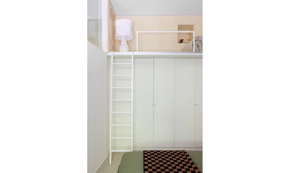 L’unico arredo conservato della casa è l’armadio che riempiva la parete di fondo della camera da letto. Sfruttando l’altezza disponibile, Archiplan Studio ha disegnato e fatto realizzare un soppalco su misura che, quando serve, diventa letto in più servito da una scaletta mobile.