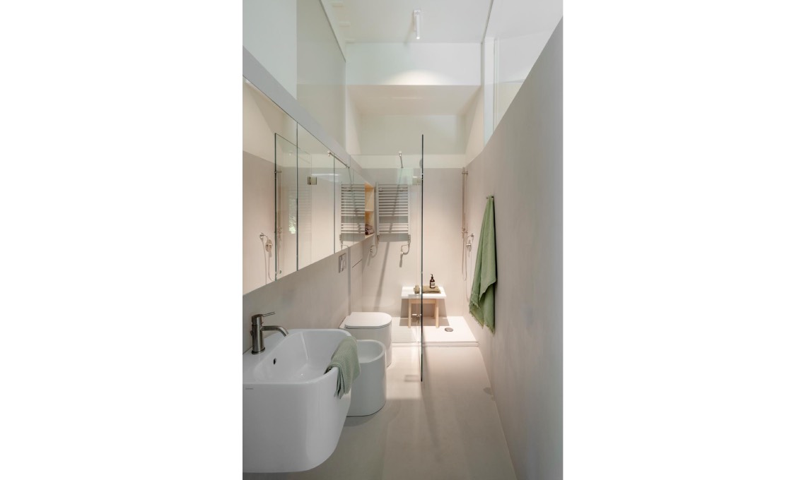 Il bagno è lungo e stretto: lavabo e sanitari compatti sono in linea e la doccia occupa il fondo del locale, sfruttandone tutta la larghezza di 154 cm. Per renderlo luminoso e visivamente più ampio, la parte alta del muro di confine con la camera è stata dotata di una vetrata che fa passare la luce, pavimento e pareti sono rivestiti in resina color cemento e i pensili sono a specchio. Lavabo sospeso [Azzurra Ceramica] e sanitari della coll. Astra [Ceramica Flaminia]. Pensili in legno con ante a specchio realizzati su misura.