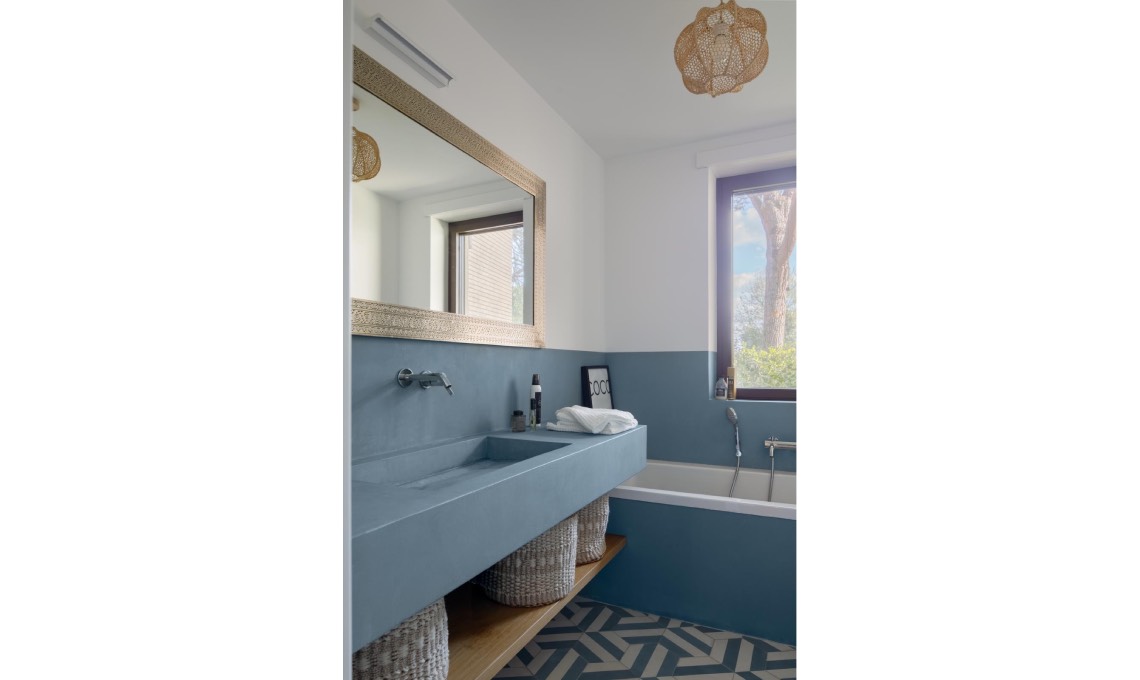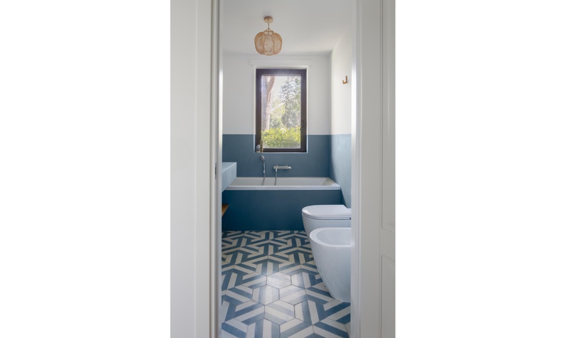 Il secondo bagno, realizzato ex novo di fianco alla camera di Giulio, è stato progettato a partire dal pavimento in cementine marocchine a motivi geometrici. La fascia in resina a parete riprende il blu cobalto delle piastrelle, come il rivestimento di lavabo e vasca, in malta ecologica. La scelta dello stesso colore anche per l’interno del lavabo dà vita a una fascia continua avvolgente, super scenografica. Lo specchio con cornice in bronzo lavorata, poi, aggiunge un accento prezioso all’ambiente.