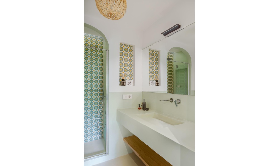 Il bagno padronale, collegato alla camera di Luigi e Carlotta, è un invito al relax in stile marocchino, molto amato dai padroni di casa. Le cementine che rivestono la doccia e la nicchia arrivano direttamente da Marrakech e sono abbinate al pavimento in resina color sabbia che le mette in risalto. Nell’ingresso alla doccia ritorna il motivo dell’arco, mentre il lavandino è realizzato in pannelli di fibrocemento rivestiti in malta ecologica, usata anche per il divano nel living.