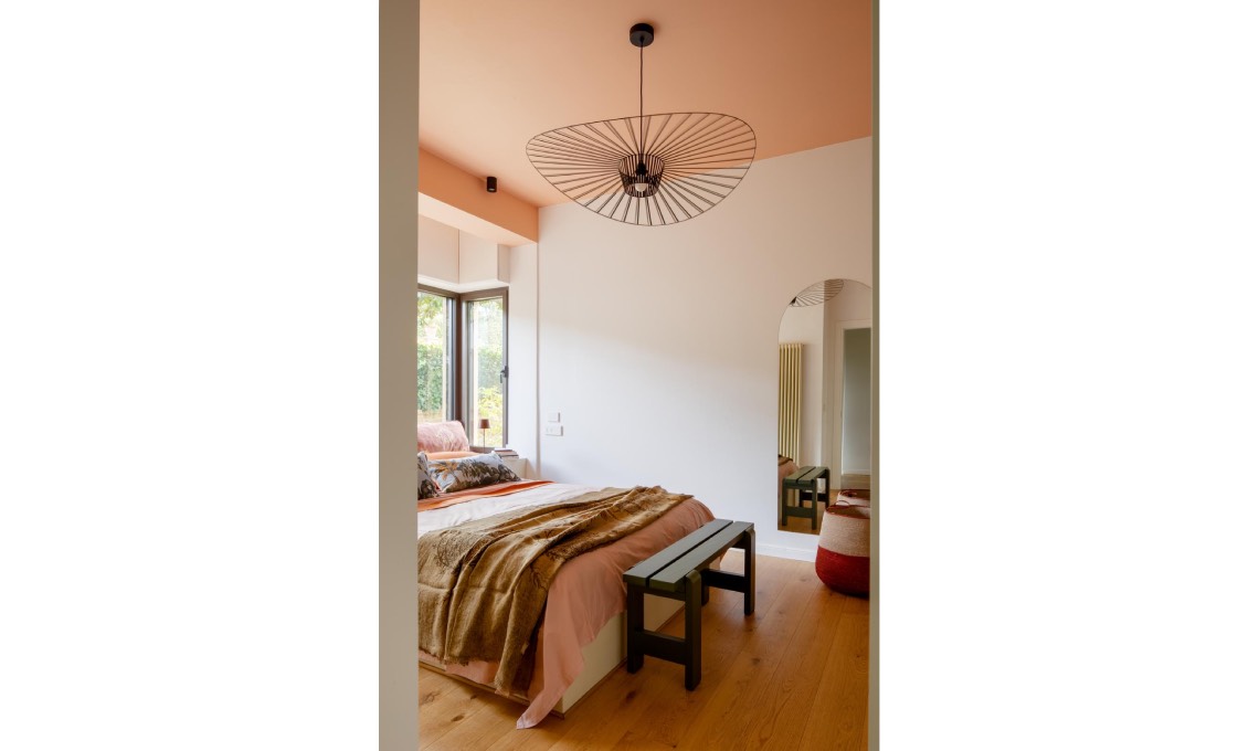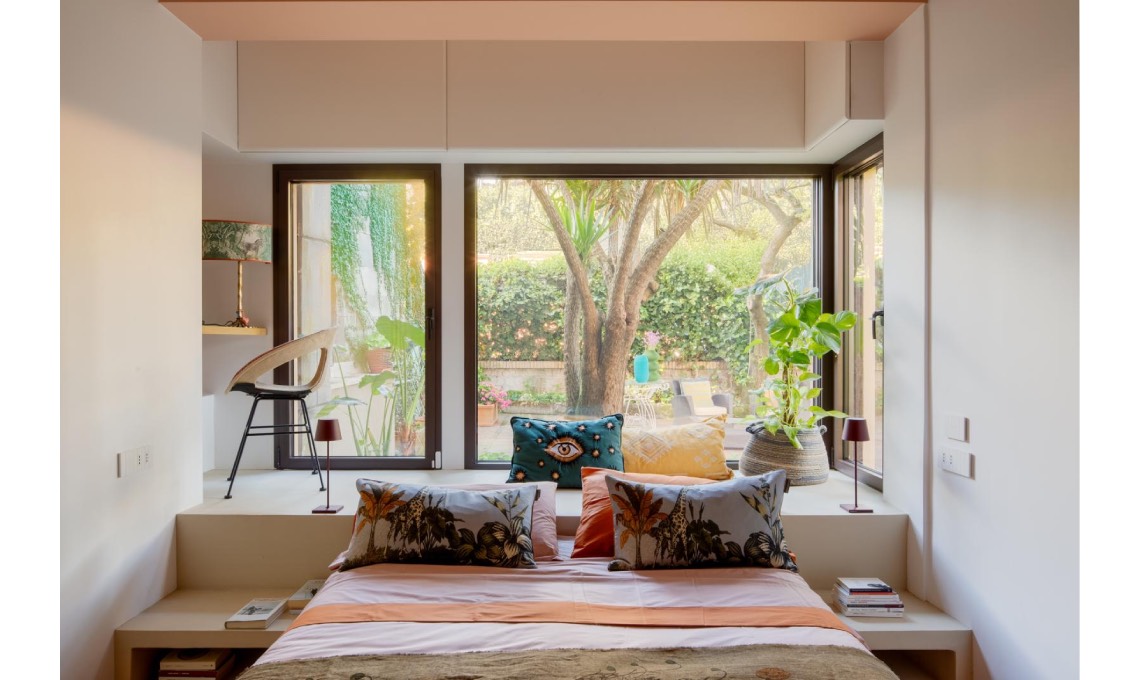 Per esaltare la vista sul giardino, l’architetta Murino ha scelto una soluzione originale: il letto in muratura si appoggia a una pedana che forma un ampio bow window, da cui si può accedere all’area verde. I comodini diventano i gradini per salire alla piattaforma, che ospita anche un mini angolo per lo smart working. Ci si sente su un palcoscenico dove il confine tra interno ed esterno quasi si annulla!