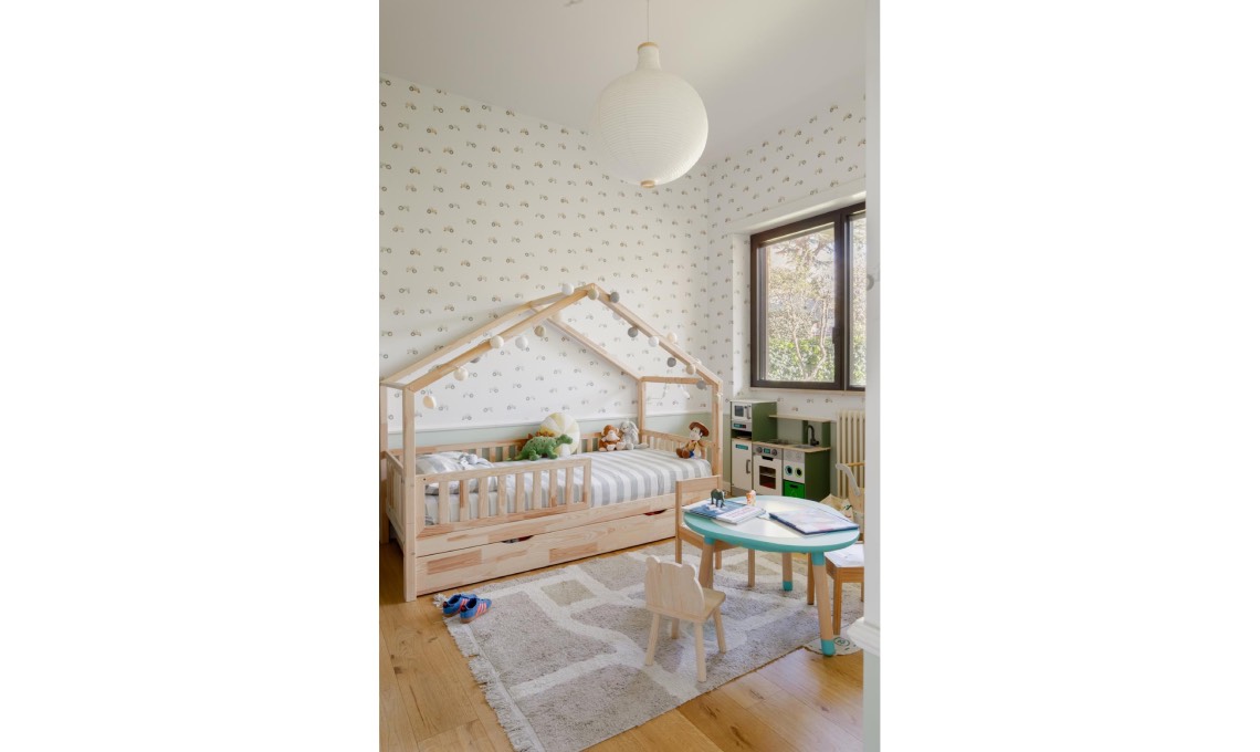 La carta da parati dai piccoli disegni di trattori personalizza la camera del figlio: è applicata sopra una fascia verde acqua che riprende il tono dell’armadio su misura. Lettino a casetta Kelly [Sklum], tavolino MuTable regolabile a 4 altezze diverse [Stokke], seggiolina a forma di orsetto [Zara Home], carta da parati Vintage tractor [Casadeco-Decoforhome]. Alle pareti, il colore è Mizzle 266 [Farrow & Ball].