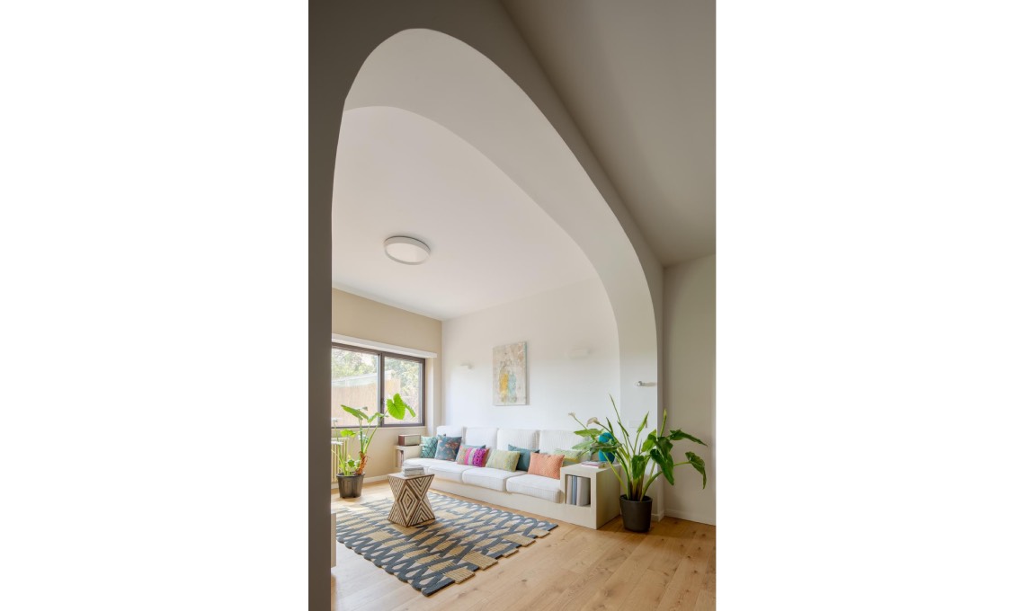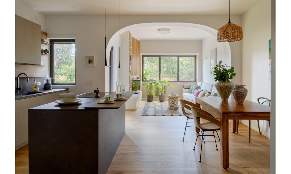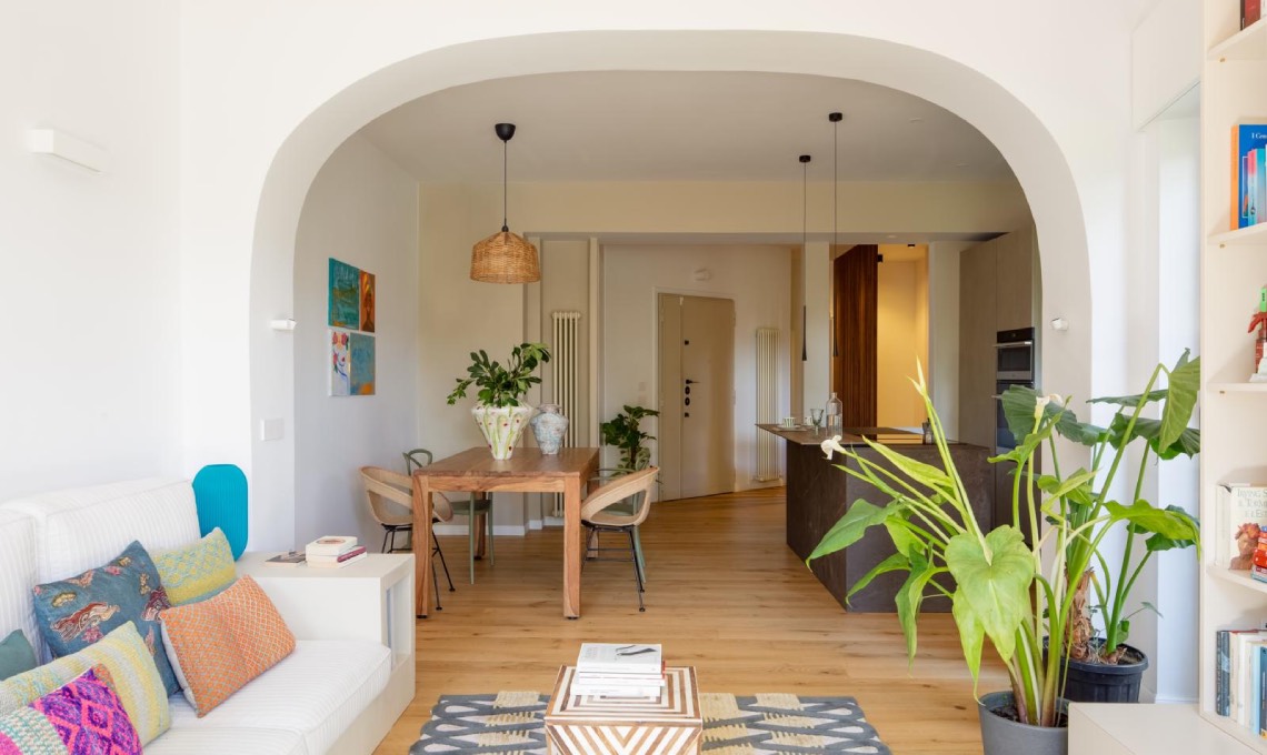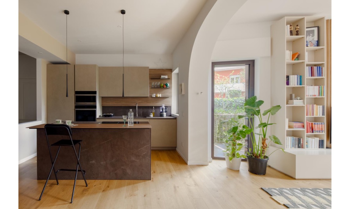 Un unico ambiente, due mood differenti: luminoso e aperto il living affacciato sul giardino, intima e accogliente la zona cucina-pranzo caratterizzata dall’isola con fornelli integrati dal colore scuro e dal tavolo in noce. L’arco ribassato segna il confine in modo soft. E incornicia la vista del giardino.