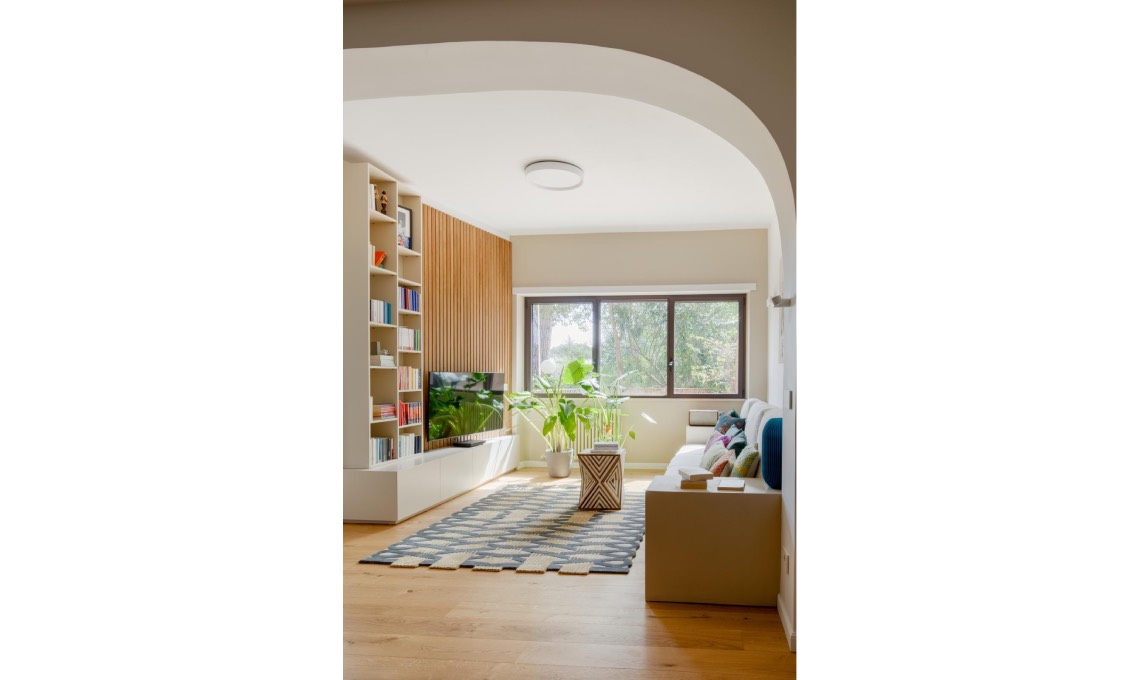 Nel living, divano e tavolino marocchino creano un’atmosfera mediterranea molto discreta, bilanciata dal parquet in rovere naturale oliato e dal mobile a tutta parete, fatto su misura. «La struttura del divano è stata realizzata con pannelli di fibrocemento, materiale resistente e leggero, rivestita con malta ecologica color sabbia dall’aspetto materico: una soluzione assai pratica da posare e più adatta a una casa di città rispetto alla muratura, di cui assicura il medesimo fascino» precisa l’architetta.