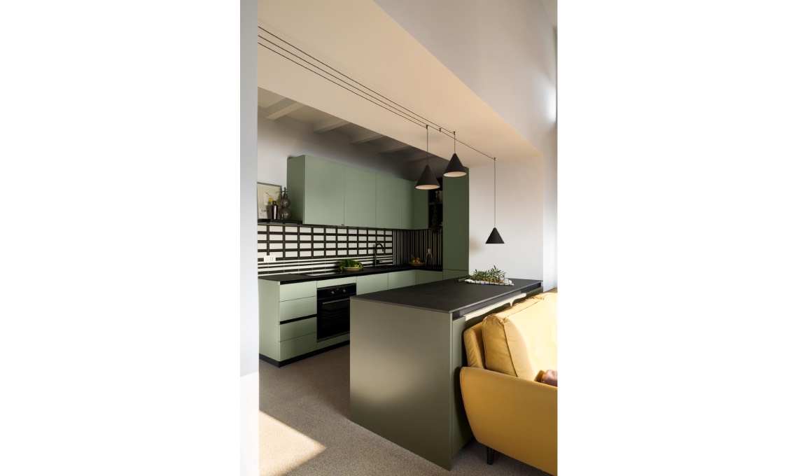 Il verde degli ulivi del giardino entra nella zona dedicata alla cucina che, nonostante gli spazi ridotti, riesce a risultare ampia e funzionale grazie alla presenza del bancone a penisola. Ma a dare carattere è la scelta di giocare con linee nere per formare diverse geometrie: la zona tra basi e pensili è sottolineata dalle piastrelle black&white che generano decori di grande impatto. Il nero è ripreso sul top, sulle gole di cassetti e ante e sulle lampade con i fili volutamente a vista.