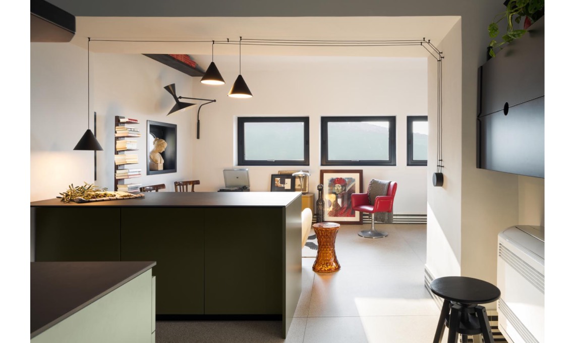 Cucina [Scavolini], sospensioni String Light Cone [Flos], piastrelle Wires, Street e Double White [Mutina]. A terra, lastre in grès Masterpiece [Lea Ceramiche]. Sgabello Stone [Kartell].