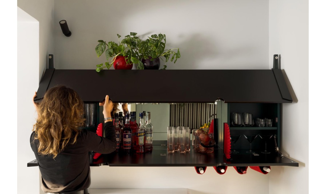 I proprietari di casa sono amanti di vino e mixology, così per loro l’architetta ha disegnato mobile bar pensile a scomparsa. «È uno scrigno che, una volta aperto, abbandona il rigore geometrico nero in favore della versatilità del verde» ci racconta. La parte centrale con specchio sul fondo è dedicata alle bottiglie e ai calici, le due scaffalature più piccole alle estremità a bicchieri e utensili da barman. L’anta in basso che ruota a 180° diventa piano d’appoggio per preparare i cocktail; quella superiore, si spiega a 270° e ricorda l’insegna di un bar a bordo piscina.