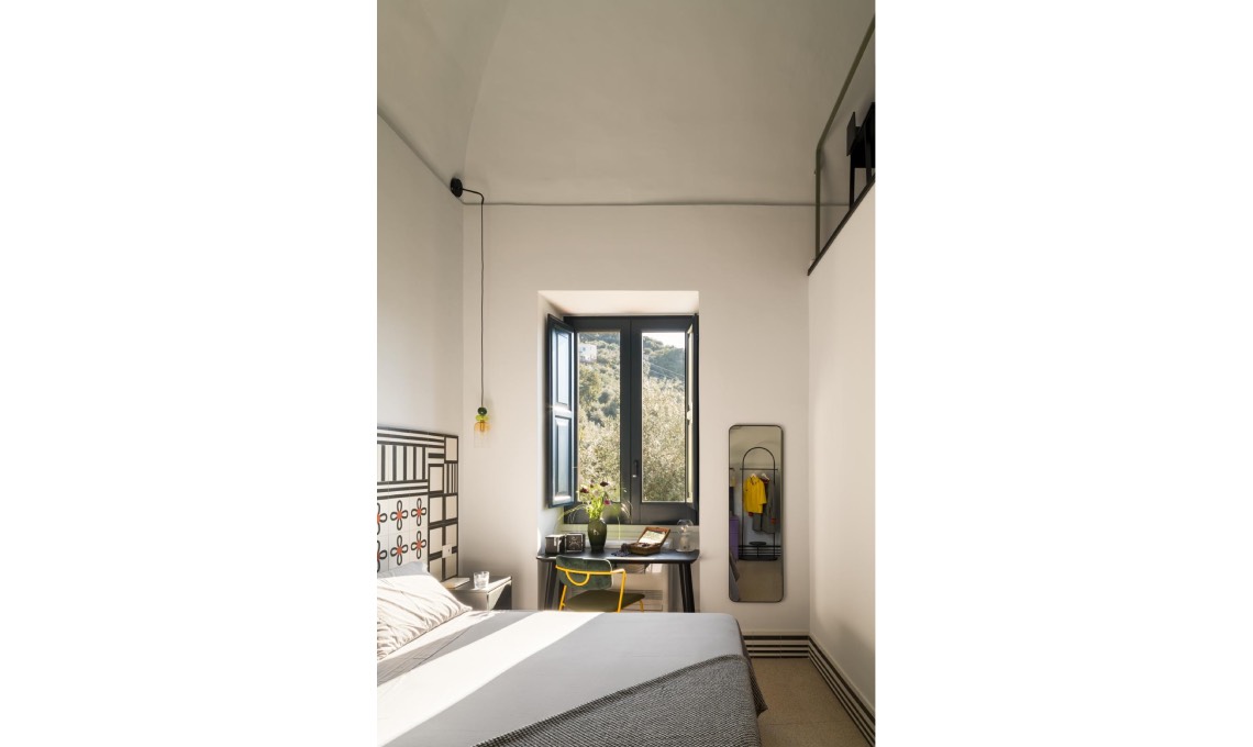 Lo spessore dei muri perimetrali ha permesso di ricavare sotto la finestra della camera una zona beauty con tavolo e sedia per truccarsi. Sospensione Murano [Nova Luce su » westwing.it]. Sedia Irun [The Masie].