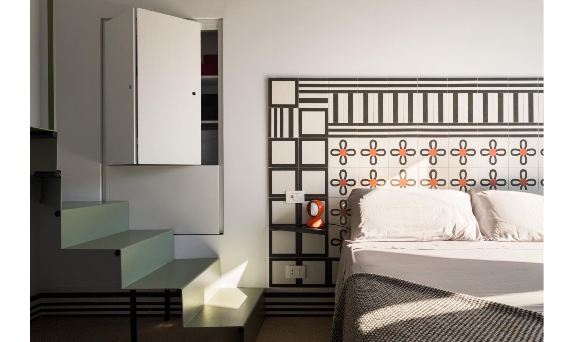 Dietro il letto c’è la testata con piastrelle effetto cementina che nel decoro ricordano le coperte patchwork delle nonne dei proprietari. Piastrelle effetto cementine Petal, Wires, Street e Square Black [Mutina]; sulla mensola, lampada da tavolo Eclisse arancione [Artemide],