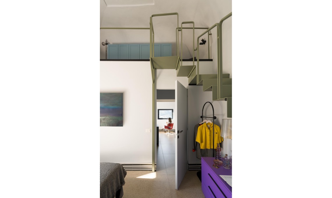«Il soppalco, ammorbidito nella volumetria dalle curve del soffitto a volta e riscaldato dalla pavimentazione in parquet, si configura in modo autonomo rispetto agli altri ambienti di questa casa» ci racconta l’architetta Valentina Autiero. Accoglie sia la cabina armadio sia una piccola zona home office ma lascia spazio libero per fare meditazione e yoga. Sotto la scala a nastro, realizzata su disegno in lamiera d’acciaio presso- piegata verniciata verde oliva, appendiabiti nero in metallo simile a Angui Clothes Rack [Aytm] e a Archie [Broste Copenhagen]; sulla cassettiera, lampada Bourgie [Kartell].