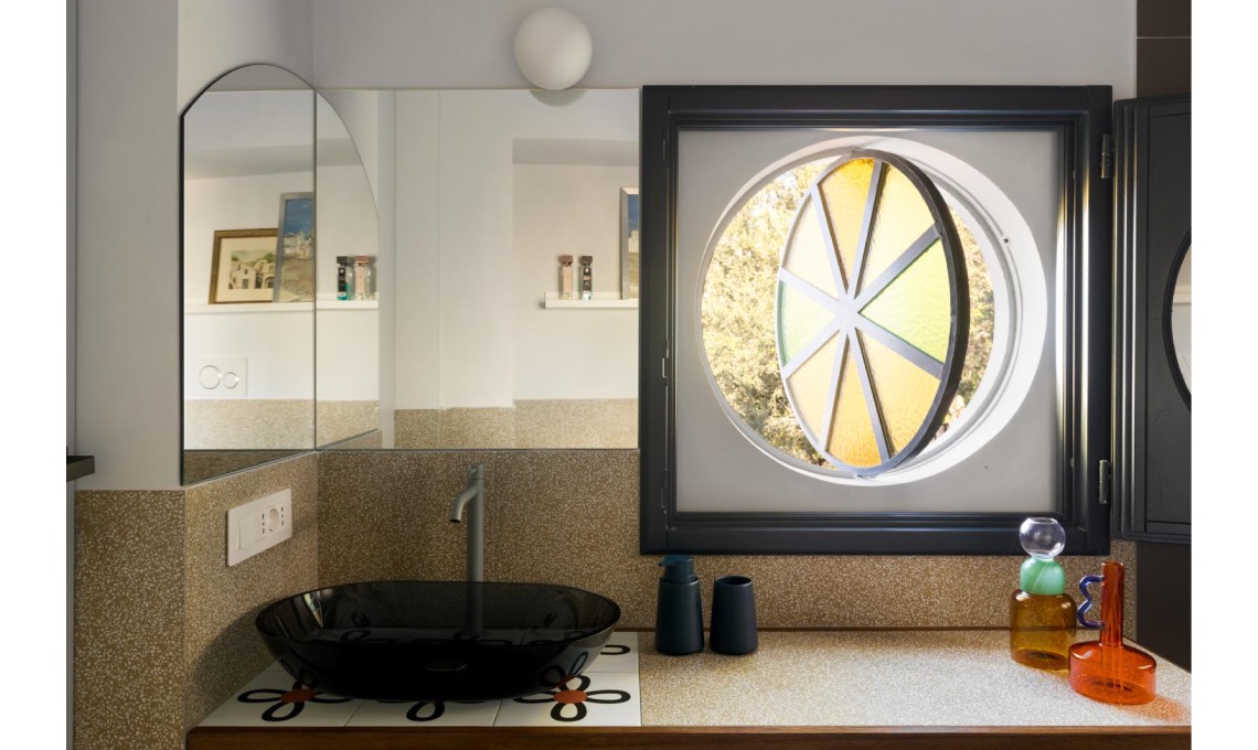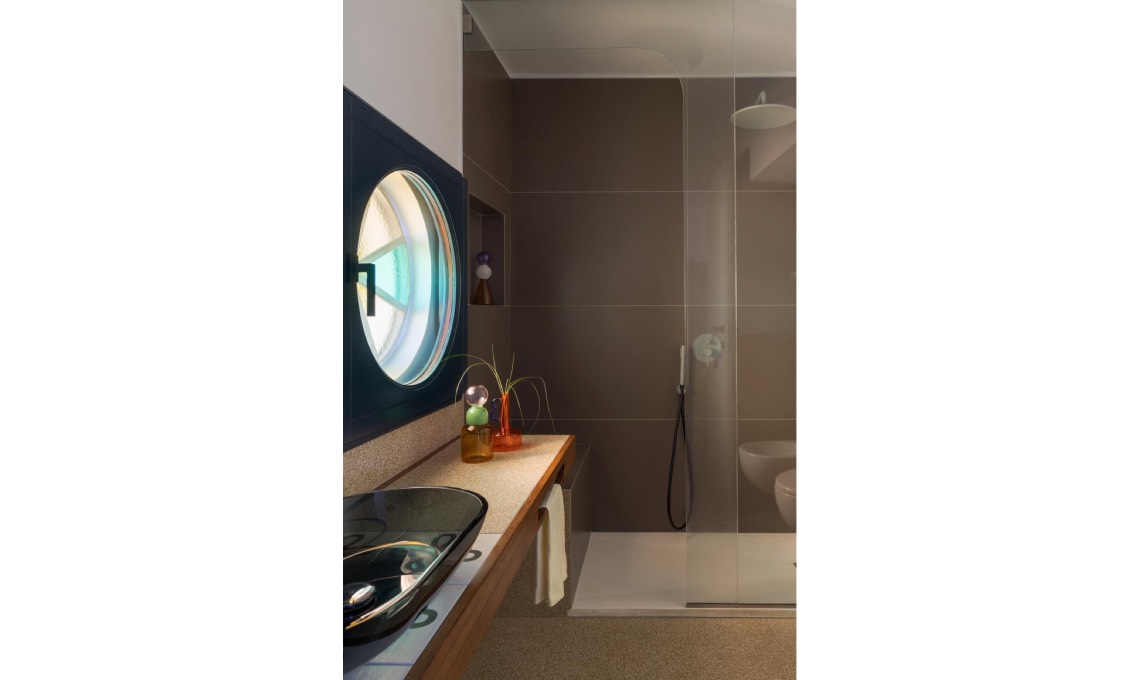 Il bagno ha una finestra a oblò in vetro cattedrale multicolore con vista sul giardino che ha ispirato le scelte formali e cromatiche del locale. Per esempio, la doccia ha il vetro che disegna un arco e richiama l’infisso. Una lunga mensola con asola per gli asciugamani si sviluppa sotto la finestra e ospita il lavabo a bacinella; qui il top, rivestito con le stesse piastrelle effetto seminato di pavimento e parete, è impreziosito dal medesimo decoro patchwork a fiori stilizzati della testiera del letto. Per l’isolamento termico è stata inserita una ‘controfinestra’ laccata blu notte come quelle delle altre stanze.