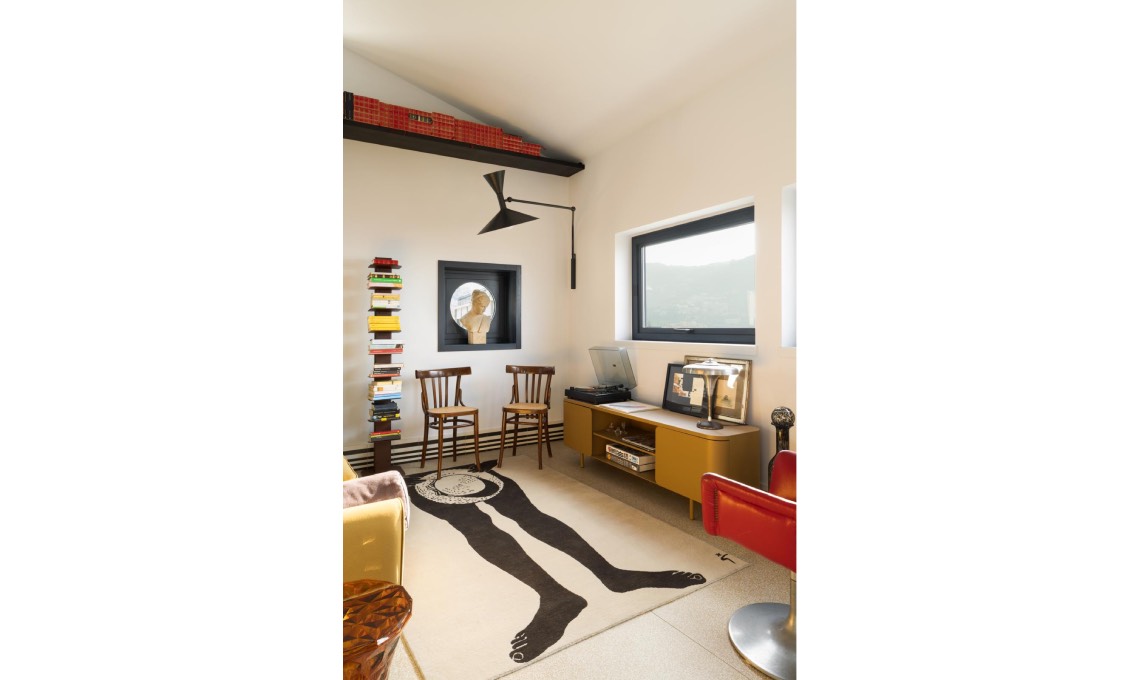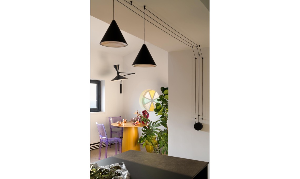 «Nella zona pranzo i colori sono ispirati agli spicchi in vetro cattedrale dell’oblò con vista sul giardino che filtrano una luce multicolore» racconta l’architetta Valentina Autiero. «Il tavolo giallo con base plissettata e top circolare, insieme alle sedie trasparenti viola, gioca in modo cangiante con la luce naturale». Tavolo Irem in legno e acciaio [The Masie] con sedie La Marie [Kartell]; lampade Lampe de Marseille nera [Nemo Lighting]; sospensioni String Light Cone [Flos].